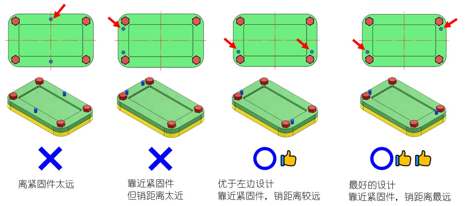定位銷位置最好的位置在緊固件(螺絲)的附近,并且2個定位銷間有更遠的距離,例如: 下圖最右方,定位銷設計在螺絲旁,并且2個相距最遠。