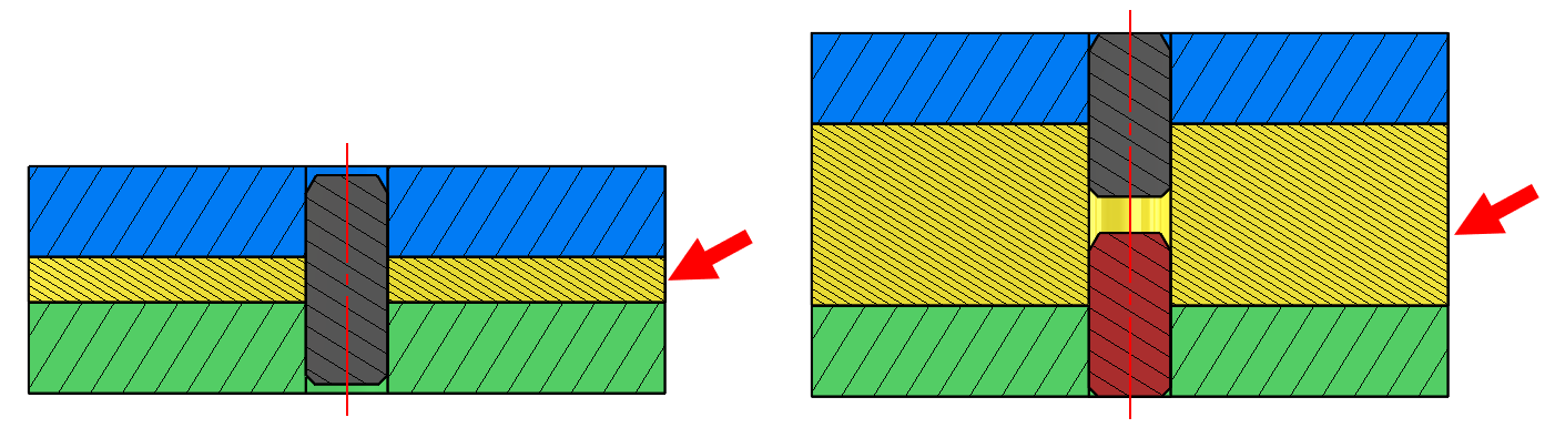 以定位銷同時定位 3 零件,銷的數量取決于中間鏈接件厚度。 當鏈接件厚度薄,用一個銷貫穿鏈接即可; 若連結件厚度太厚,就必須改以 2 個定位銷來固定。