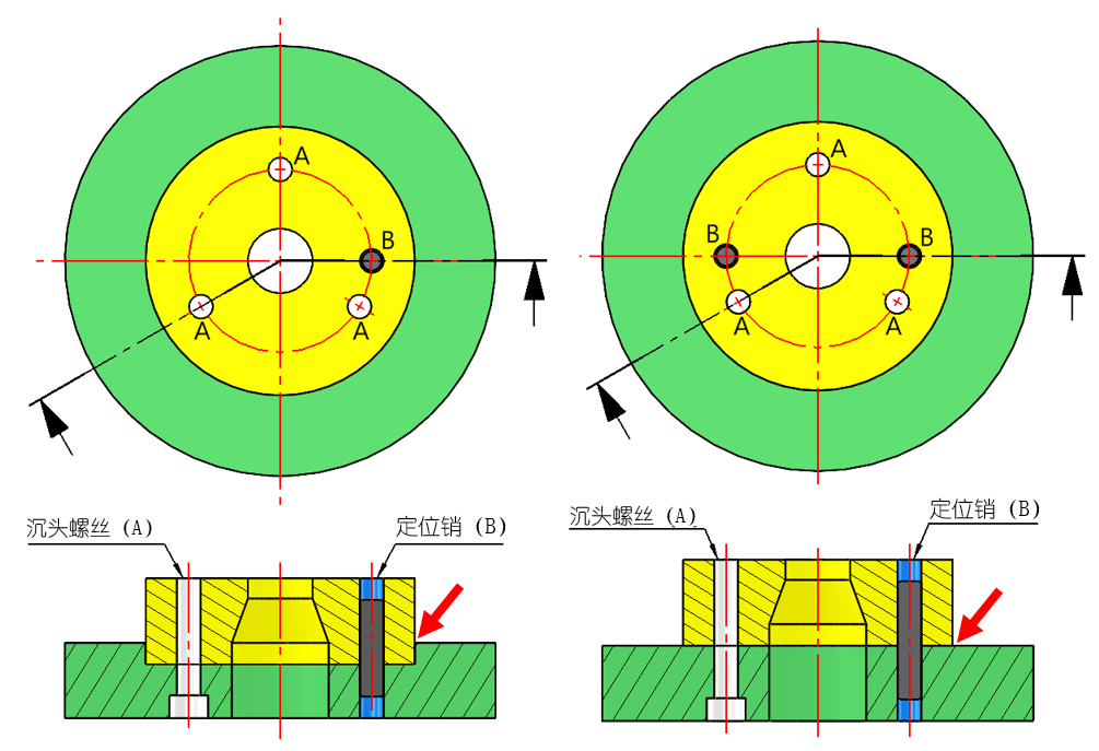 當法蘭為凸緣嵌入式時,由于下方法蘭(綠)的凹槽可以限制上方法蘭(黃)的位置,設計一個定位銷即可,如圖左。 若為平面式,沒有法蘭凹槽的限制,要設計兩個定位銷定位,如圖右。