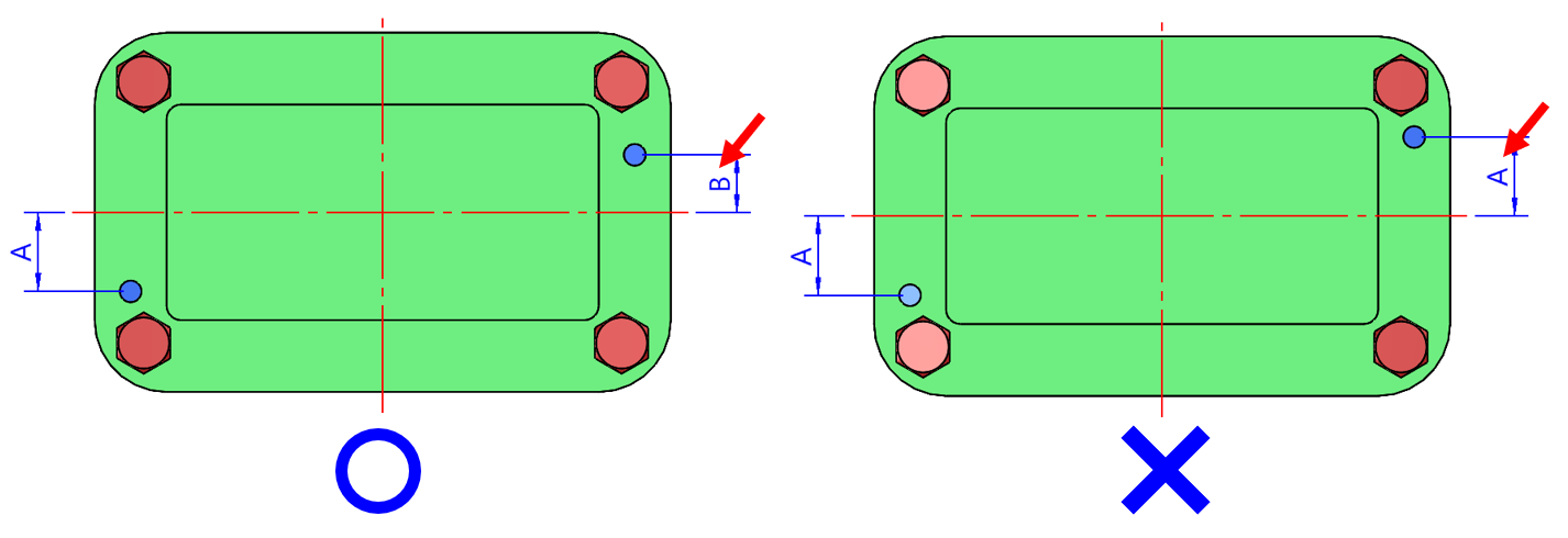當定位銷設計在對稱位置,在現場組裝容易發生零件裝反現象,進而影響到機構運動或是造成零件的磨損,所以最好采取左圖范例,將2個尺寸設計不同,算是一種防呆裝置。